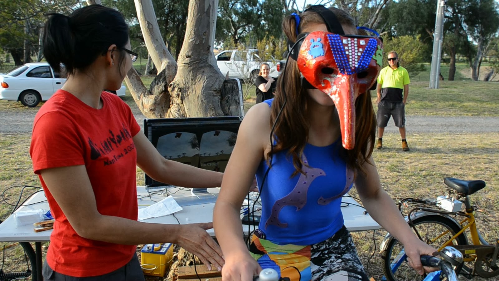 As I brace myself forthe onslaught of the Falls Festival in Lorne, Here’s a hastily slapped down  breakdown of the bike powered computer game concept we launched at the Nati Frinj. There were 3 games made but they all hinged around the use  of  an arduino to forward a bunch of information capture off the bike via a range of sensors into  Unity which generated the visuals in response.  The Oculus Rift was a late but excellent addition to the setup. I had originally intended to build a little head sized projection booth so that only cyclist could see.