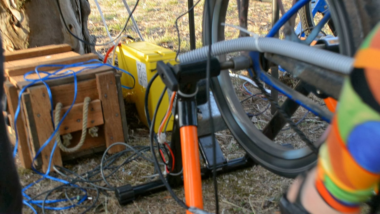 The generator sits up against the back wheel replacing the standard roller in one of those bike training stands. Having the adjustable height feature of the training stand was pretty convenient. In the background you can see the regulator (in the old ammo box) that could take the surplus power from all the bikes and feed it into the (yellow) deep cycle battery.