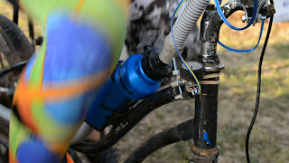 The  dial rubbing against the front steering fork (scavenged off an old oven) is stuck to a potentiometer and feeing back the steering info.