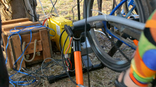 In the background you can see the  Regulator and battery setup courtesy of Greer Allen of Magnificent Revolution. Does a great job of capturing an storing all the spare power generated by the bike. The Bike is more than capable of generating the power to run the laptop (35watts) and oculus (5 watts +  maybe some coming out of the computer USB???)