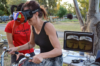 Compared to this though, a pair of goggles that responds to the orientation of the riders head and provides the visuals in 3D just takes it a step beyond the original concept. When we were building this rig the plan was that the entire power for the game be generated by the cyclist and the power consumtiption of the goggles beat out any comparable projection system (without even factoring n th nightmare of me trying to sculpt up a firbeglass projection  dome). I must be the only person ever to have bought an Oculus Rift for its relatively low power consumption.